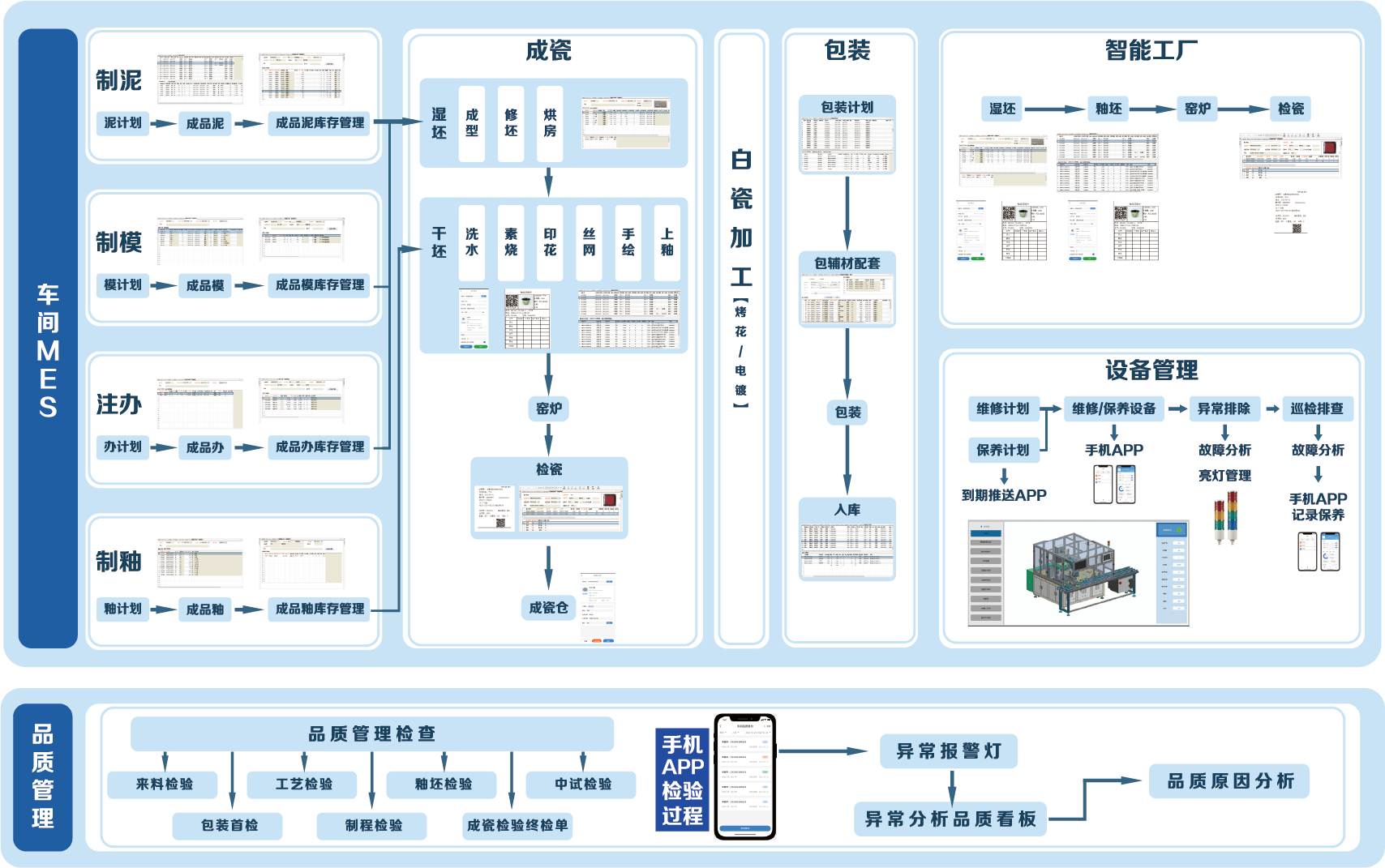 1) 全流程数据贯通:系统实时采集窑炉温度、泥釉配比等关键生产参数,打通从原料投料到成品出窑的全流程数据链路,彻底打破各环节信息孤岛,实现数据实时共享与同步;